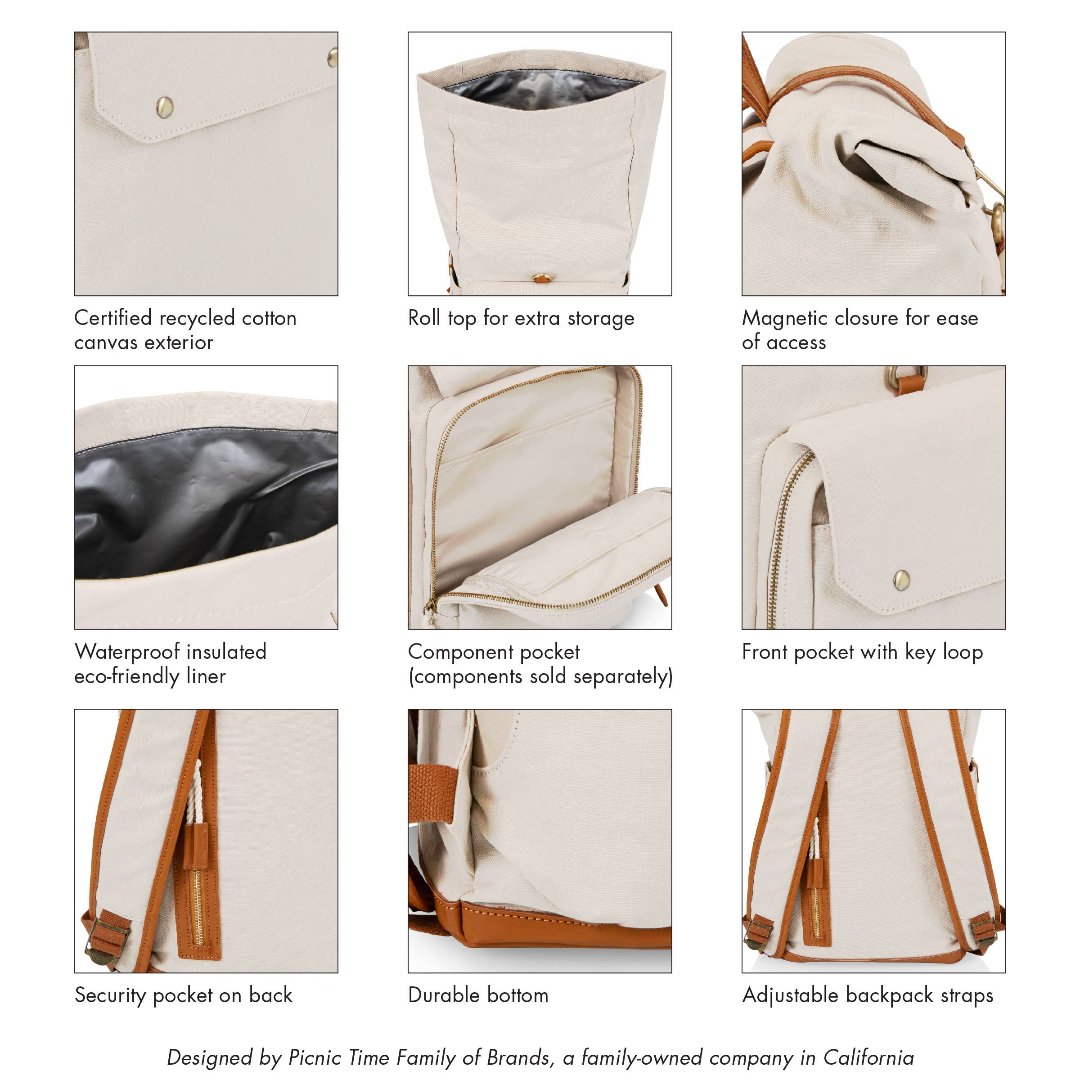 Our Big Bend Roll Top Picnic Backpack Cooler brings together a certified recycled Cotton canvas exterior with a waterproof, insulated, eco-friendly interior to create one stylish and functional package. But wait - that’s not all! The component pocket in this soft cooler bag can easily store all the picnic accessories you need for a true portable party, the roll top provides even more space for snacks and drinks, and the durable bottom helps keep everything in this outdoor cooler dry. Imagine yourself hiking, boating or biking with this gorgeous piece on your back!