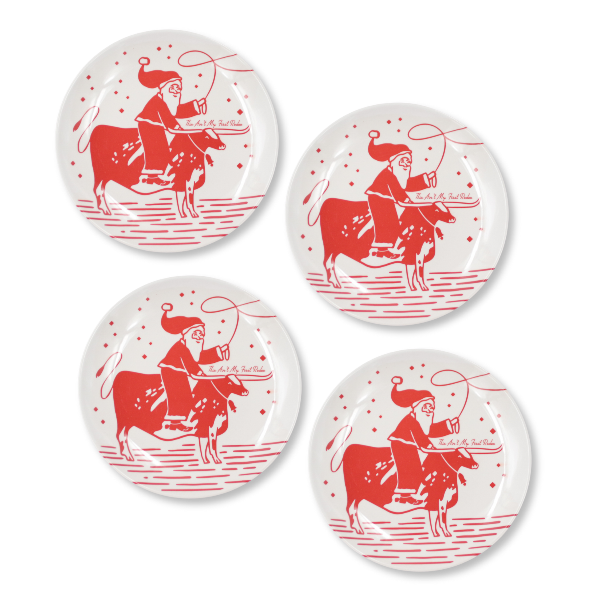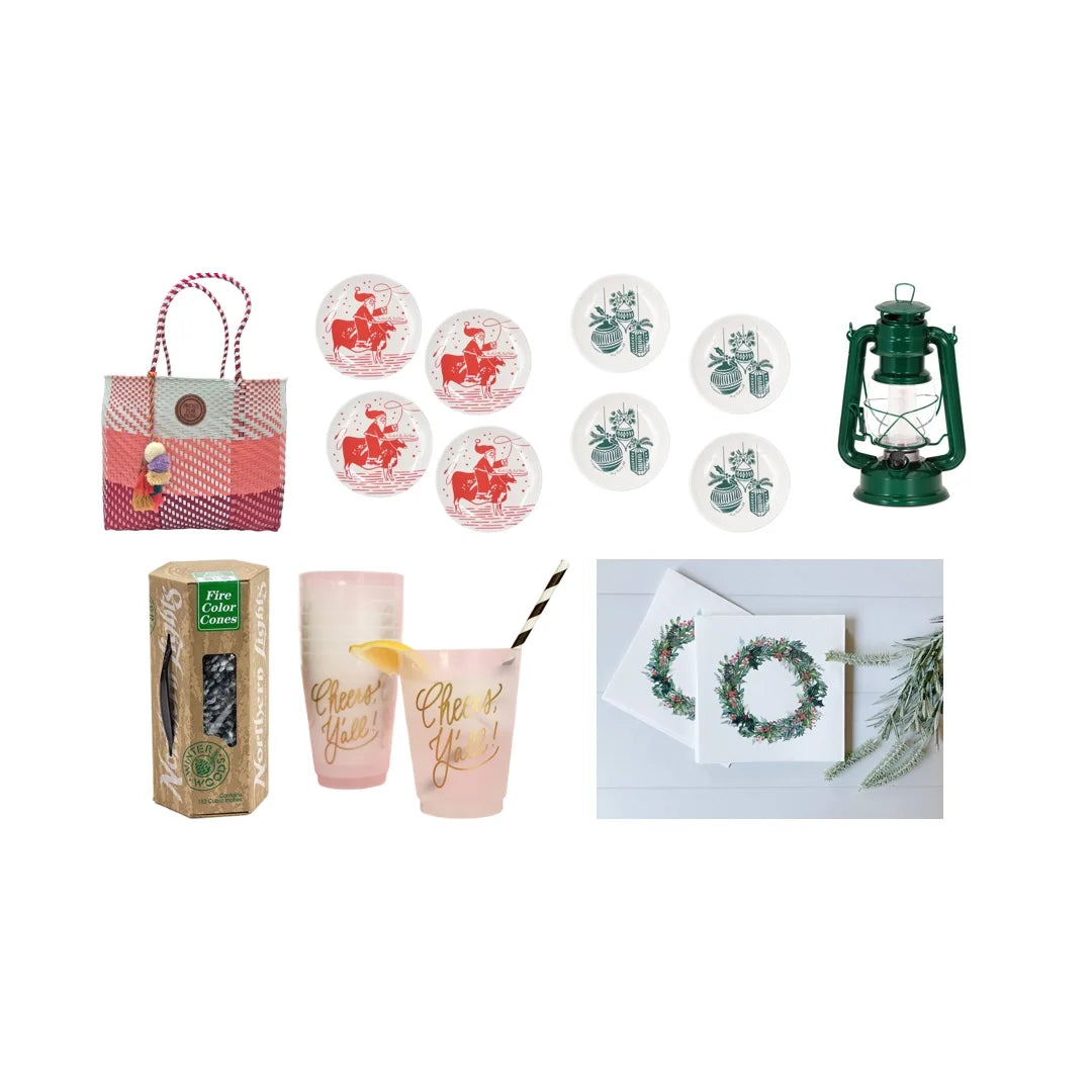 Your hostess will swoon when you hand her this package of holiday whimsy and delight! This set includes 4 each of our 'Not My First Rodeo' and 'Merry Christmas, Y'all!' melamine plates, along with color fire cones (for fireplace entertainment!), a gorgeous green latern, 'Cheers, Y'all reusable cups', and jolly holly wreath cocktail napkins, all which are tucked in our delightful red woven tote. No matter the recipient, all of this Texas fun in the holiday package will hit just right!