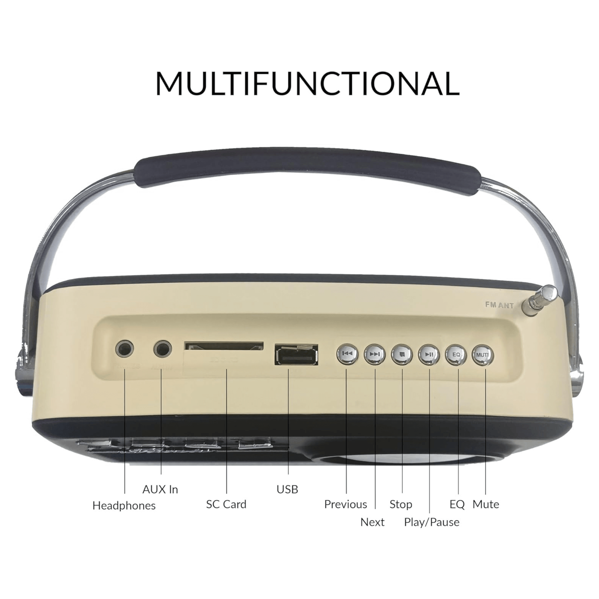 Take this cute, vintage-inspired speaker anywhere for a 1950s vibe. Perfect for parties, picnics, and home office decor. With Bluetooth 5.0, it pairs instantly and offers powerful, high-quality sound. Enjoy your favorite tunes wherever you go. Up to 6 hours of music on a single charge.
